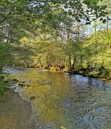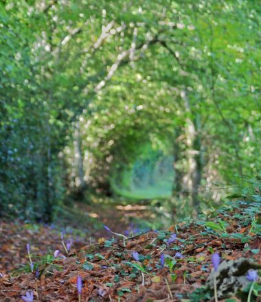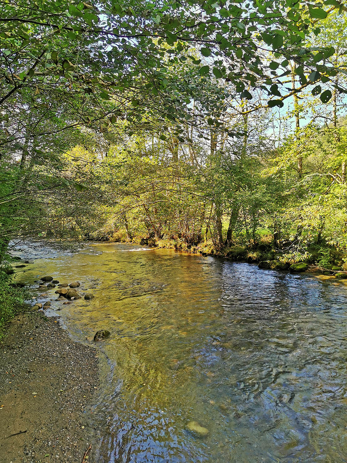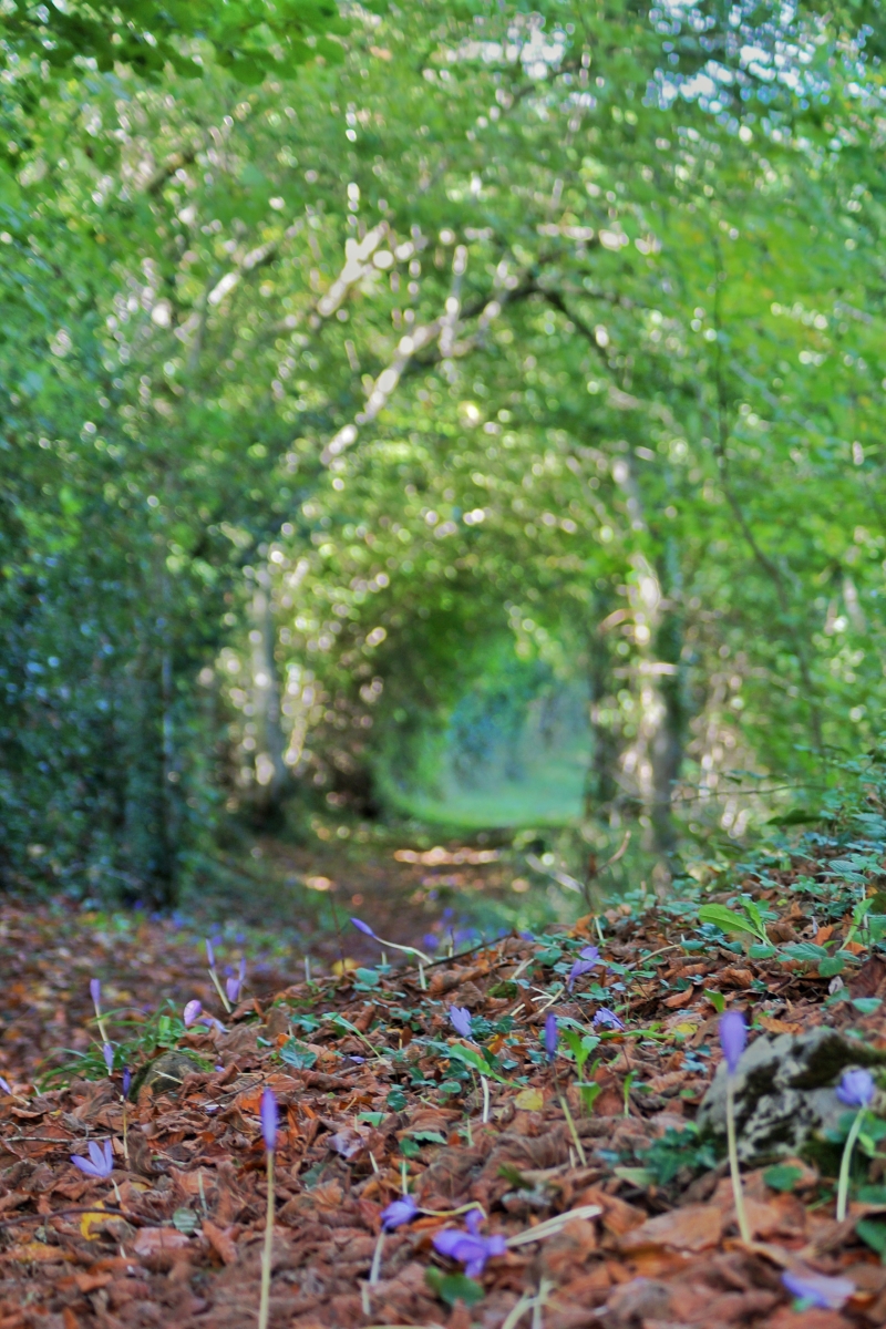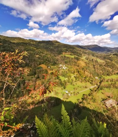 Qu’est-ce que j’aime sentir l’automne qui arrive… La mélodie apaisante de la rivière m’accompagne pour ensuite laisser place au bruit des feuilles mortes qui crépitent sous mes pieds. Je croise les dernières mures, et une dizaine de champignons différents, que je suis incapable d’identifier… La prochaine fois, je prendrai un livret sur les champignons ! Les paysages sont variés, entre forêts et points de vue sur la vallée. Il y a quelques passages boueux, mais ça ne me dérange pas. Marcher dans la boue et s’aventurer dans des chemins qui demandent un peu d’équilibre : mon âme d’enfant se régale.