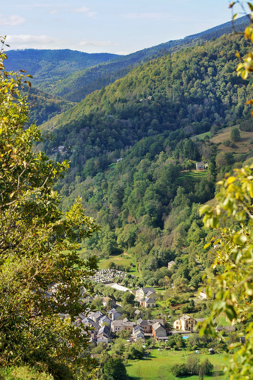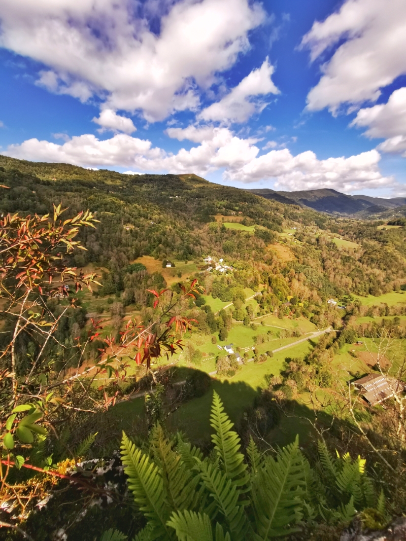 Je ne sais pas par où commencer. D’un côté, au loin, le village de Massat et son clocher semblent si paisibles au cœur de la vallée, de l’autre le village de Biert joue à cache-cache derrière quelques branches. La vue sur les montagnes Couseranaises qui se couvrent doucement de leurs couleurs automnales est toute aussi grandiose. C’est le spot idéal pour s’arrêter, contempler, et grignoter un bout. Mais pas avant de m’être emmitouflée dans ma veste et mon bonnet. Une fois arrêtée, le froid tombe vite !