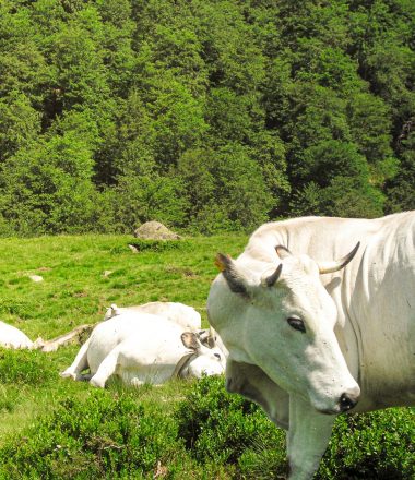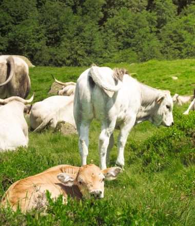 La balade commence sur un magnifique plateau verdoyant occupé par nos emblématiques vaches gasconnes (attention : belles de loin ! On évite les selfies et les gratouilles sur les oreilles). Les ruminantes nous accueillent sur un rythme bien de chez nous avec leurs cloches qui nous mettent tout de suite dans l’ambiance et résonnent tout au long de notre cheminement.