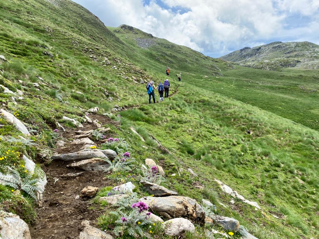 Les jambes sont plus solides, pas d’ampoule aux pieds, le sac semble plus léger : le corps s’adapte à la contrainte qu’on lui impose. La météo est toujours radieuse, toujours autant de fleurs ! La montée au col de Girette est longue… longue et raide. Louis et Jacky coupent les lacets pour prendre en photos nos mines grimaçantes ! Puis nous basculons versant Français.