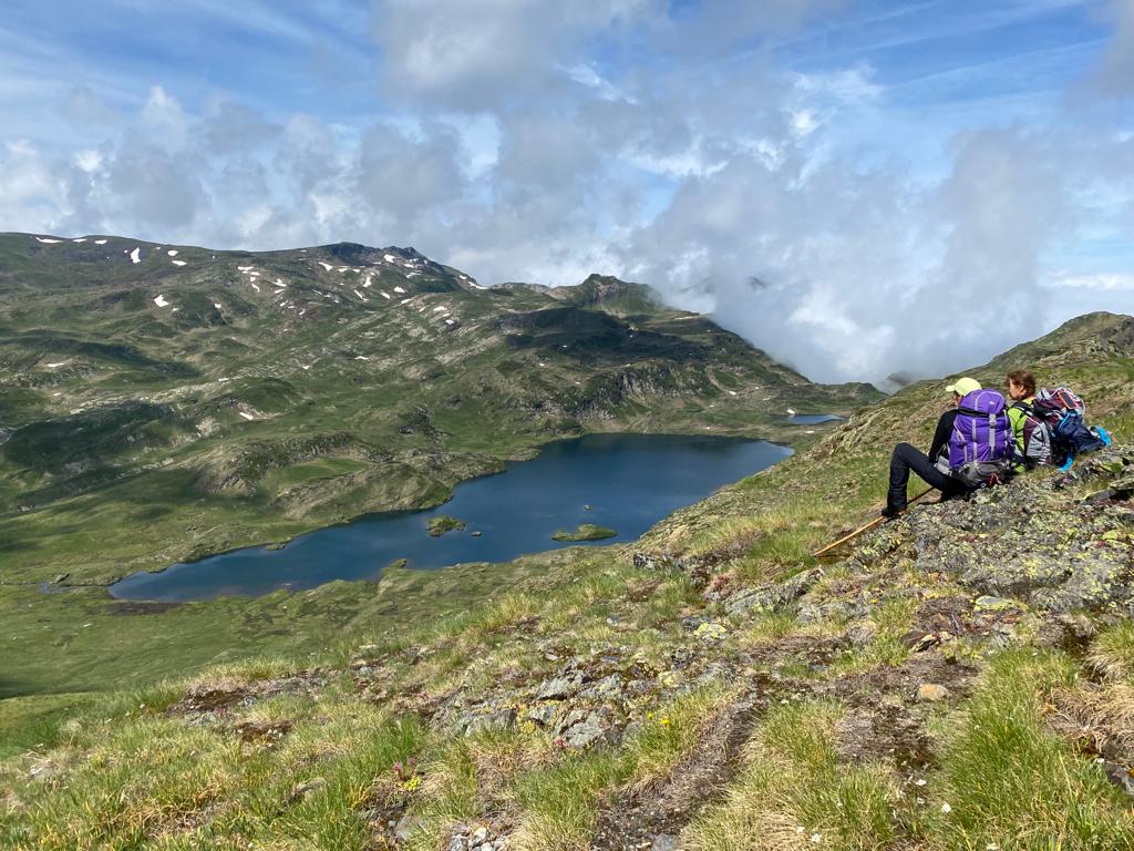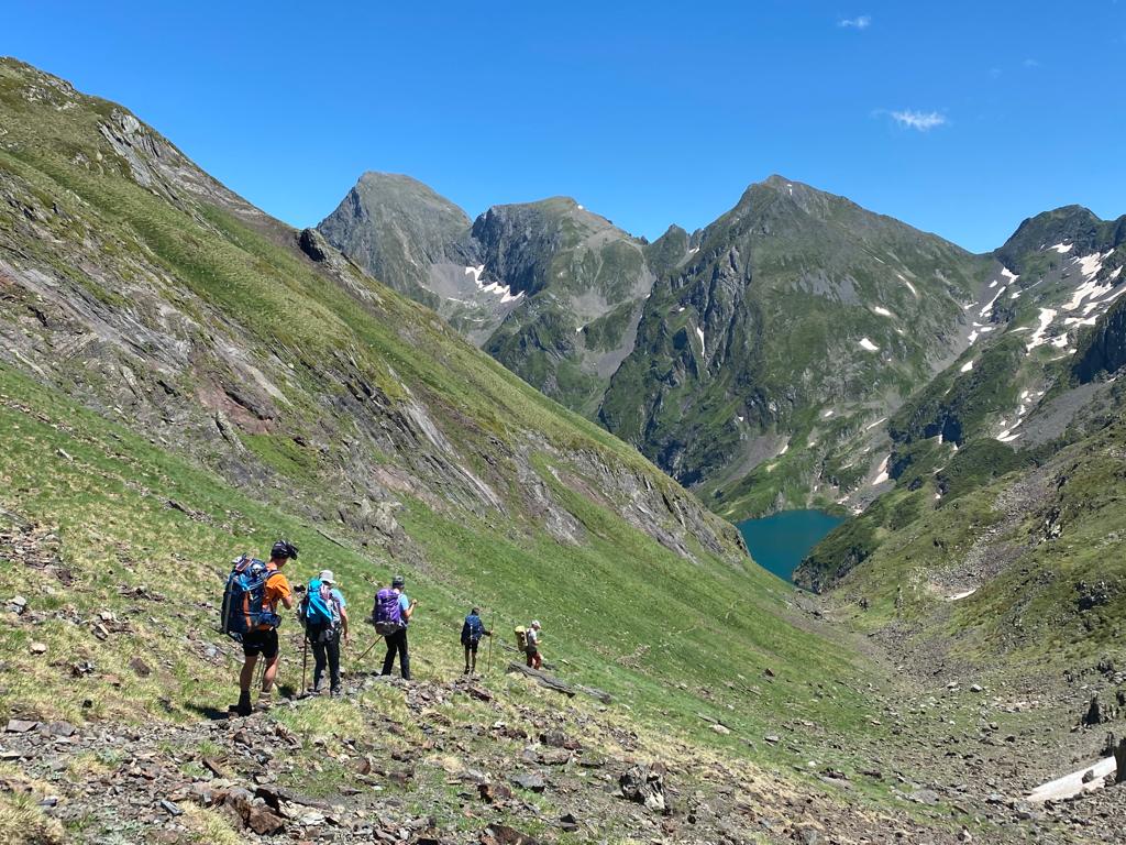 Le vent nous empêche de faire la pause déjeuner au col de Barlonguères. Tant pis, nous nous contentons de la vue imprenable sur l’étang Long, le Valier et le refuge des Estagnous pour engloutir le pique-nique savoureux préparé par le cuisinier de Montgarri.