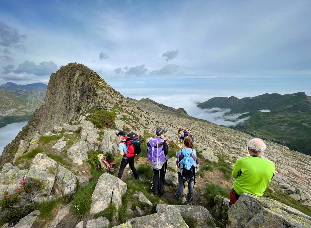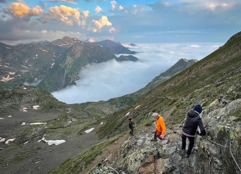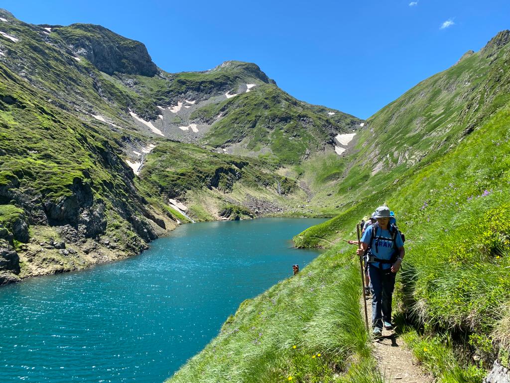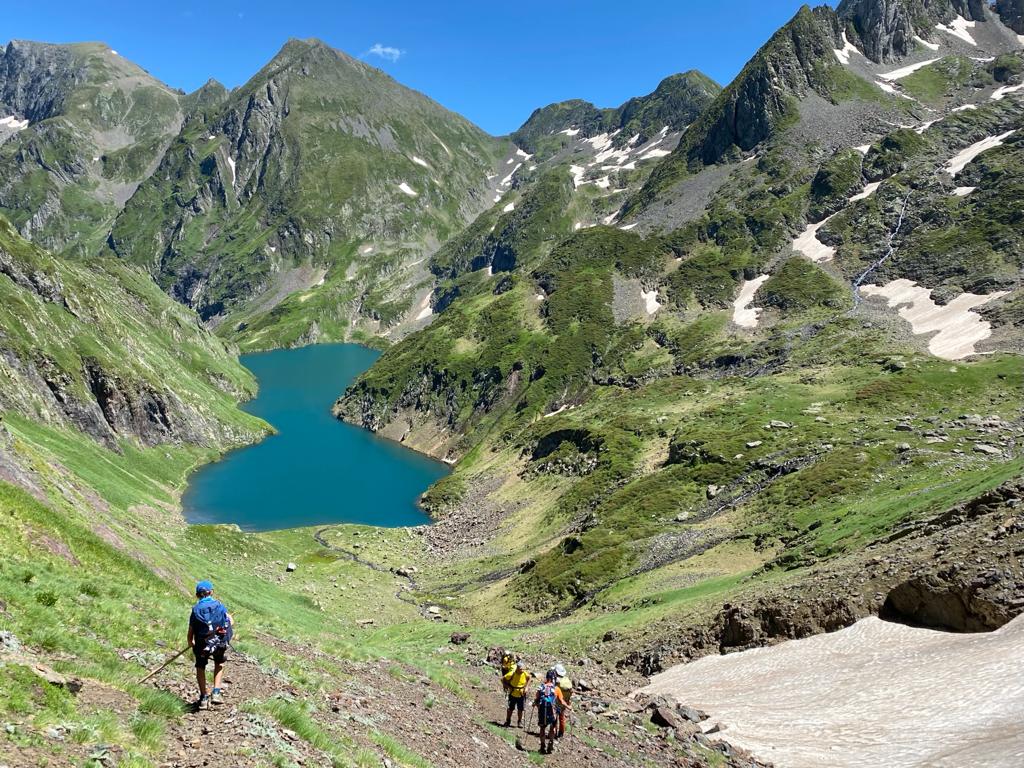 Petit déjeuner très tôt, montée rude vers le Portillon d’Albe. Le moral monte en flèche quand, dès le Portillon, le soleil nous accueille et nous découvrons à nos pieds l’immense étang de Liat que nous allons suivre de haut un long moment.