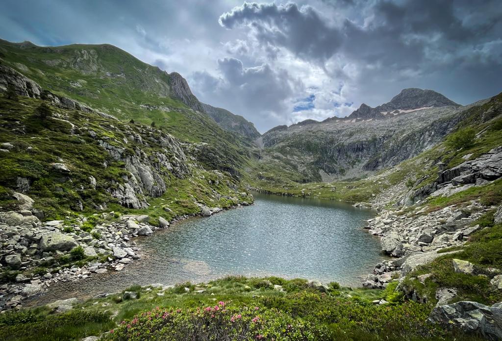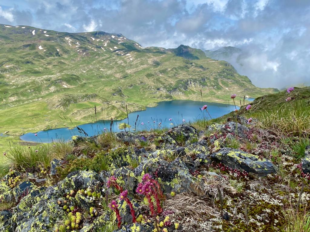La longue traversée vers le Maubermé et l’étang de Moutoulieu est magnifique. Petits lacs, des fleurs à profusion, le paysage montagnard se déroule sous nos yeux avec le massif de la Maladetta, l’Aneto en toile de fond. Nous sommes bien !