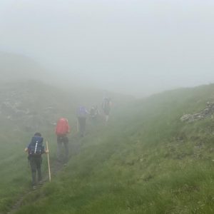 Au Bentaillou la bruine nous rattrape, nous enfilons le poncho, et tels des escargots nous attaquons la montée de la Serre d’Araing à la queue leu leu.
