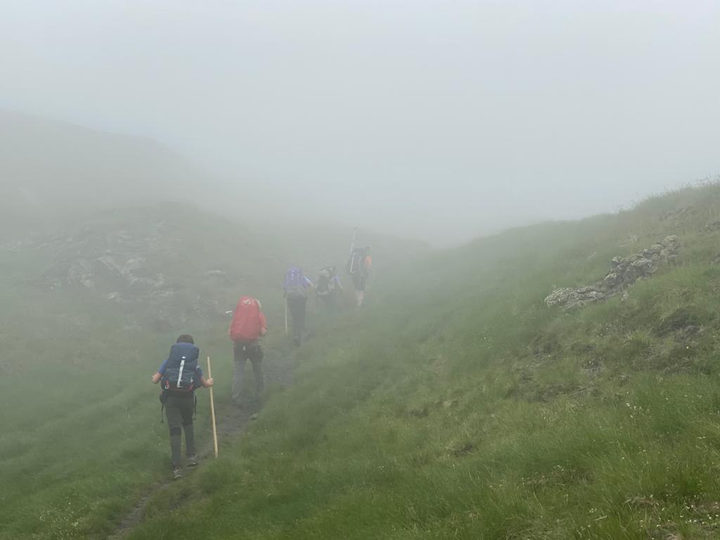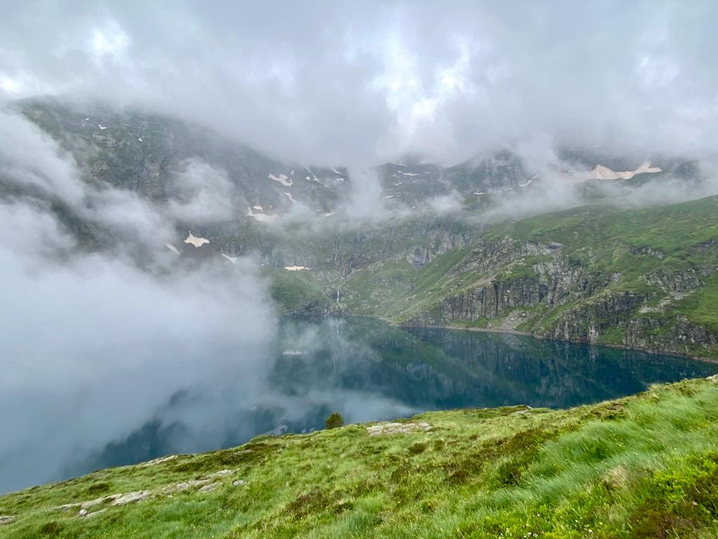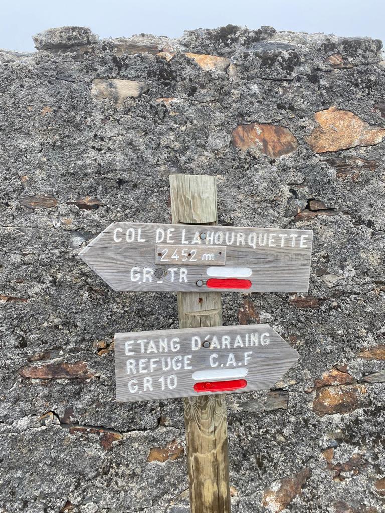 Dès que l’on quitte le refuge, la côte est tout de suite rude au milieu des blocs de granit. Au Col de Pécouch, dernier coup d’œil au refuge et aux étangs Long et Rond. Il nous faut désormais rester concentré pour la descente des Lauzès, vaste étendu de dalles de granit, en direction de l’étang de Milouga. Nous sommes bien versant français avec les brouillards légendaires !