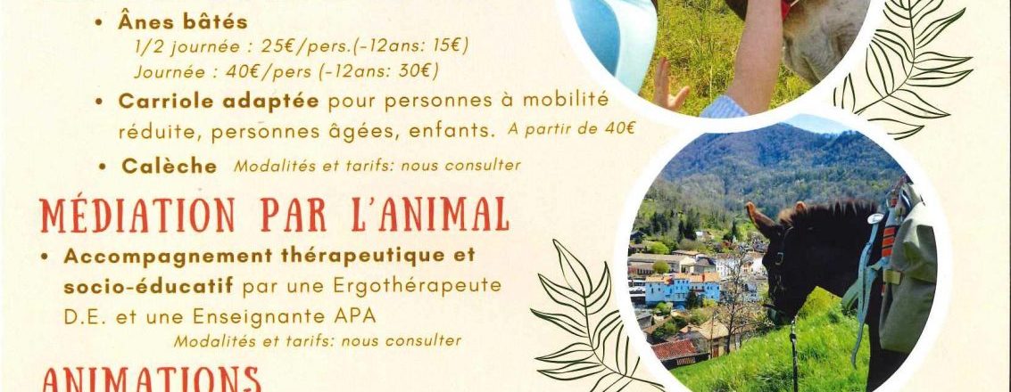 - ânes bâtées : demie journée ou journée : préparation des ânes, balade accompagnées de Corinne ou Marion. Pique nique non fourni mais porté par les ânes !