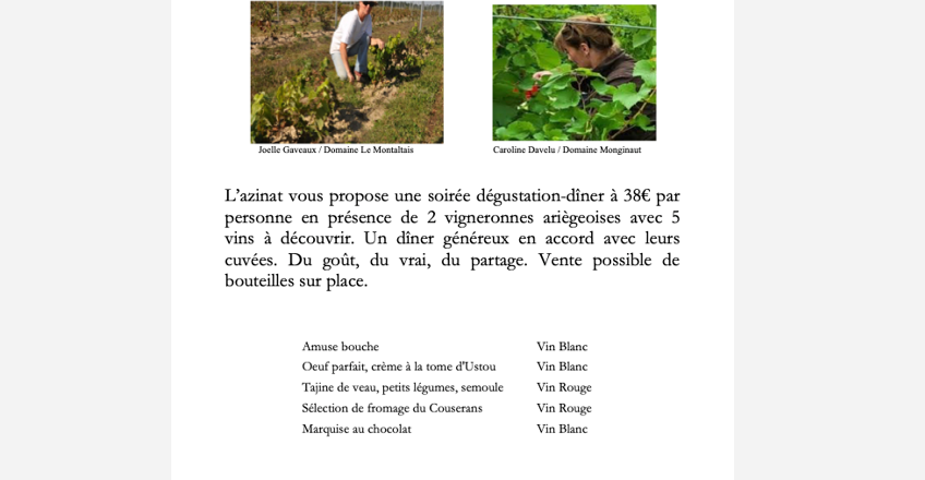 L'azinat vous propose une soirée dégustation-dîner en présence de 2 vigneronnes ariègeoises avec 5 vins à découvrir.