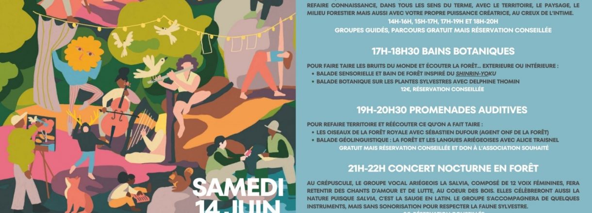 - 19h-20h30 balades auditives : gratuites (oiseaux de la forêt ou langues locales)