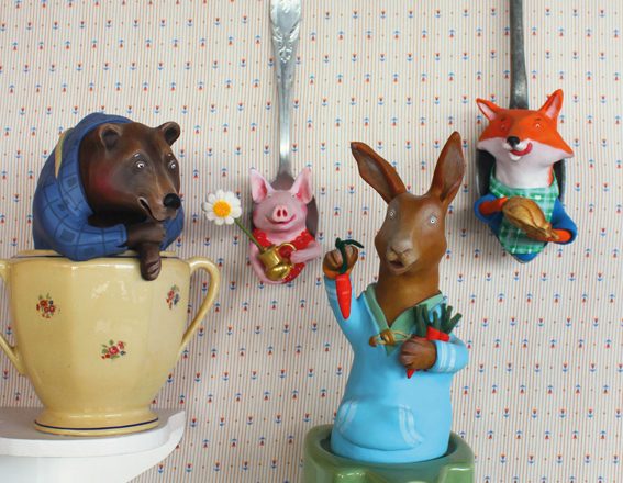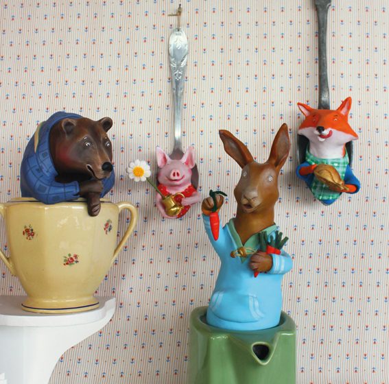 L’univers de Milie est plein de gourmandise et de fantaisie. Elle récupère des objets du quotidien, souvent des ustensiles de cuisine et leur donne une deuxième vie en y logeant des animaux anthropomorphes qui racontent chacun une histoire un brin rigolote.