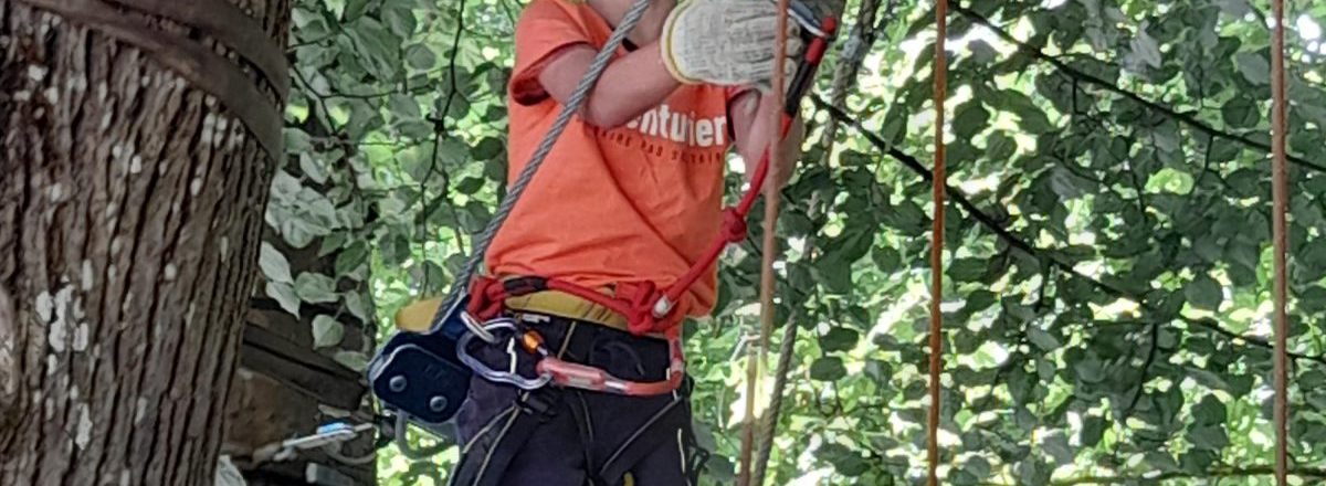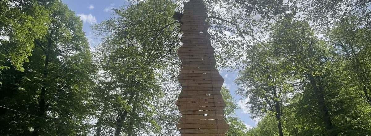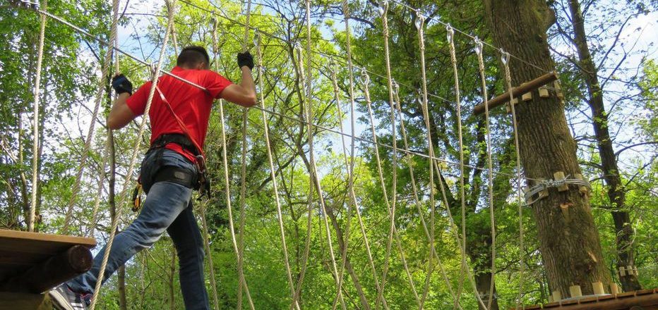 jeu de tyroliennes auquel on accède par un mur d'escalade