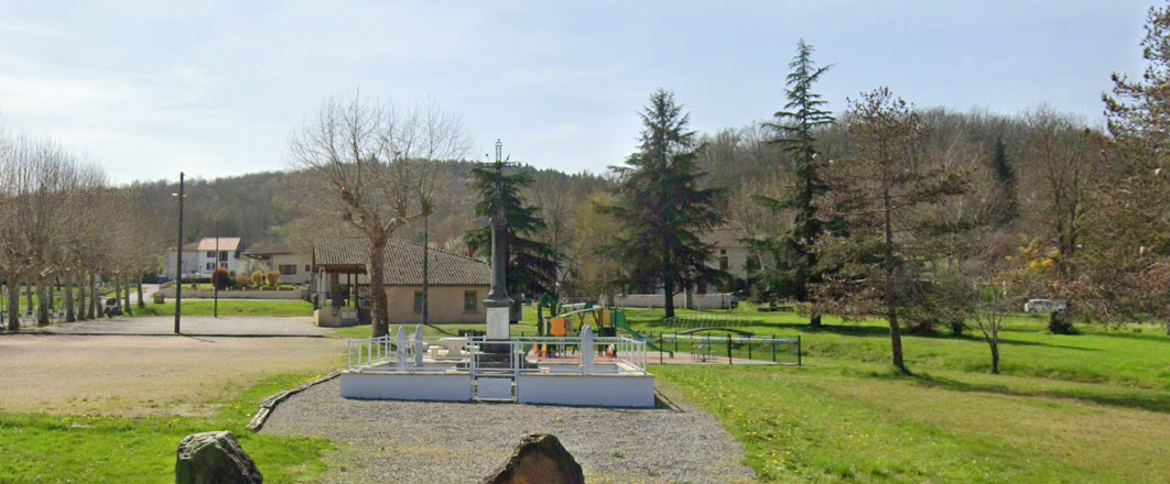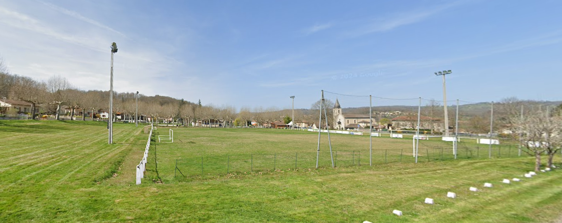 Super terrain de jeux ensoleillé avec grand terrain de sport, balançoires, tourniquet, marelle, structure et toboggan.