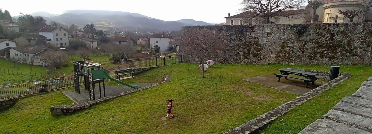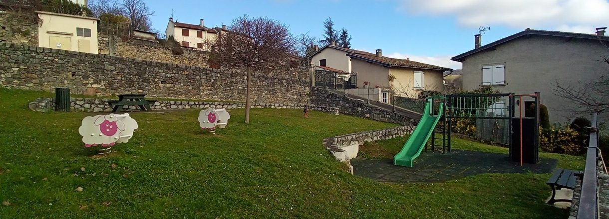 Au coeur de la cité de Saint Lizier, aire de jeux avec modules à ressort et toboggan pour enfant de 2 à 8 ans