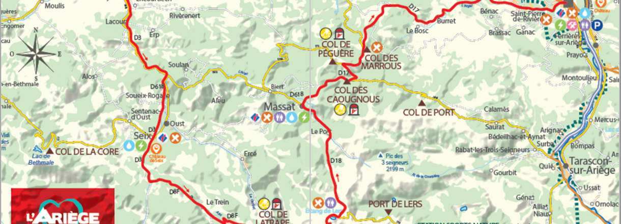 De Saint Girons à Seix Au départ de l’office de tourisme Quai du Gravier Maurice Gardelle, prendre l’avenue Galienni, au rond-point prendre la troisième sortie direction Foix D117, poursuivre au prochain rond-point prendre la première sortie D3 direction Seix. Passer Lacourt, puis prendre le pont à droite sur la rivière du Salat. Au bout du point prendre à gauche direction Seix toujours D618, jusqu’au rondpoint prendre la première sortie à droite toujours vers Seix sur la D3. De Seix à Massat Traverser Seix puis direction Couflens par la D3. Ensuite, bifurquer à gauche vers la D8F en direction d’Aulus-les-Bains. Passer par le Col de Latrape avant d’arriver au village d’Aulus les Bains. Continuer sur la D8F après Aulus-les-Bains puis remonter le col d’Agnes jusqu’à l’étang de lers pour la direction de Massat en passant par la D18. De Massat à Foix Dans Massat, prendre la direction de Saurat Tarascon sur Ariège D618. Monter jusqu’au col de Caougnous. Au col prendre à gauche la D17 pour débuter l’ascension du col de Péguère. A partir du Col de Péguère, continuer votre chemin sur la D17 en direction de Le Bosc. Traverser Serres sur Arget, Saint-Pierre de Rivière avant de rejoindre Foix