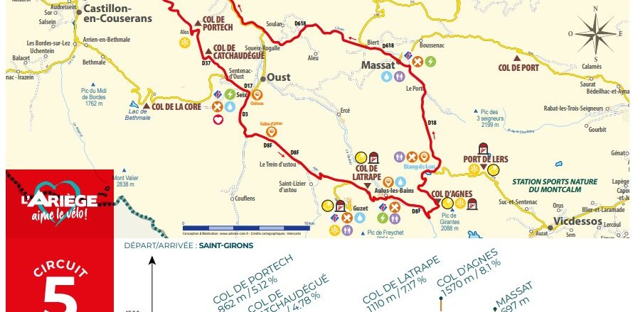 De Saint-Girons à Aulus-les-Bains Au départ de l’avenue des Aristide Bergès, rattraper le rond-point et prenez la première sortie en direction de Moulis sur l’avenue du Maréchal Foch puis la D618. Arrivé à Moulis , bifurquer à gauche en direction de Alors via la D137. Après Alos, vous allez passer le Col de Portech puis le Col de Catchaudégué par la D37 avant de traverser Sentenac-d’Oust. Continuer vers Seix par la D17 puis tourner à droite au village en direction de Couflens de Betmajou par la D3. Ensuite, bifurquer à gauche vers la D8F en direction d’Aulus-les-Bains. Vous allez passer par le Col de Latrape avant d’arriver au village. D’Aulus-les-Bains à Saint-Girons Continuer sur la D8F après Aulus-les-Bains puis remonter en direction de Massat en passant par la D18. Après la traversé de Massat, continuer sur la D618, vous passerez par Biert puis Lacourt avant de rejoindre Saint-Girons.