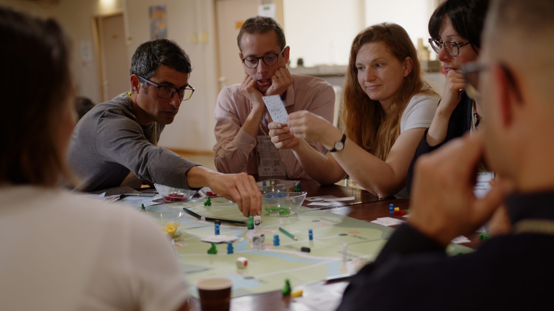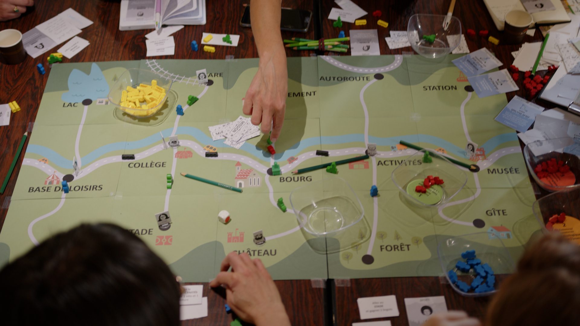 - Play-Mobile est un « serious game » au croisement de la mobilité et de l’aménagement. L’atelier a été l’occasion de tester la nouvelle version du jeu pour les territoires moins denses, avec un plateau représentant une vallée composée de routes et destinations à atteindre (camping, station, gare, bourg etc.). L’atelier a réuni 10 joueurs d’horizons divers : service mobilité à la communauté de communes, office de tourisme et agence de développement touristique, fédération de randonnée, gite équestre, camping. Chaque joueur a endossé un profil particulier qui induit un comportement de mobilité spécifique par exemple en privilégiant un mode : piéton, vélo, voiture , transport en commun. Chaque joueur avait pour objectif de réaliser un maximum de trajets, en évitant les accidents. Des évènements tels que les travaux, la transhumance sont venus perturber les stratégies « tout voiture » des joueurs. Chemin faisant, les joueurs ont été amené à se concerter pour mettre en place des aménagements adaptés dans un cadre de vie plus agréable, ainsi qu’à tester des mobilités actives, partagées, et moins polluantes.