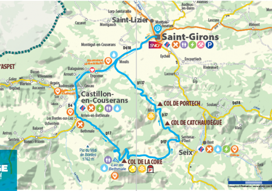 Au départ de Saint-Girons, prenez la direction de Castillons-en-Couserans pour commencer votre parcours. Faites une halte au lac de bethmale, site naturel emblématique du Couserans. Une vraie pépite si vous souhaitez faire une pause pour reprendre un peu de force.  Après la montée vers le col de la Core, vous redescendrez en direction de Sentenac d’Oust pour prendre la direction du village d’Alos. Vous aurez l’honneur de passer au col de Catchaudégué qui offre un point de vue remarquable sur la vallée du haut-salat ! C’est encore plus magnifique en automne avec ce patchwork de couleurs. Vous poursuivrez votre circuit en direction de Moulis en passant par le village d’Alos qui offre une vue juste incroyable !