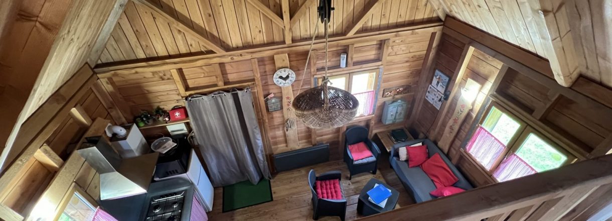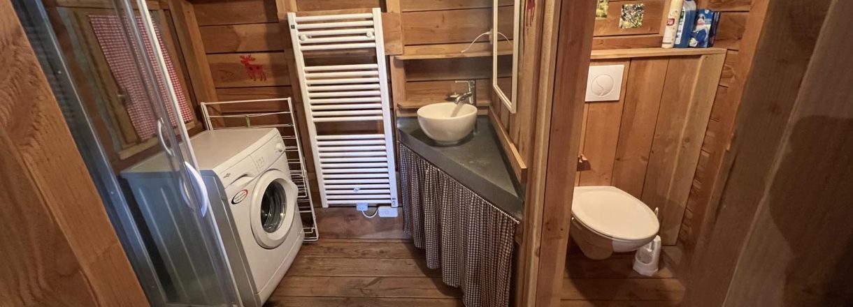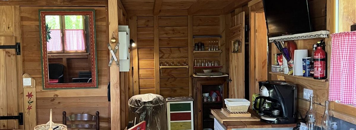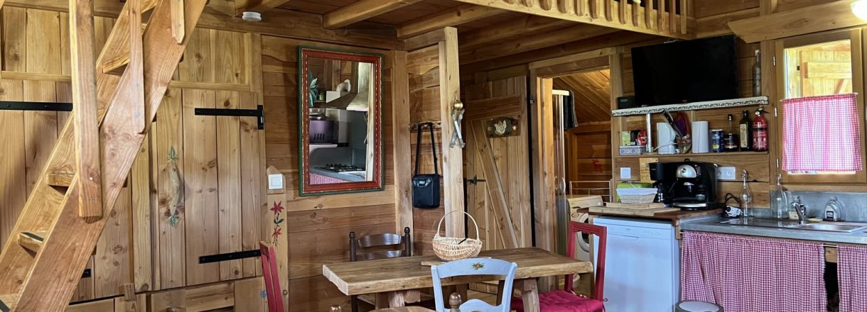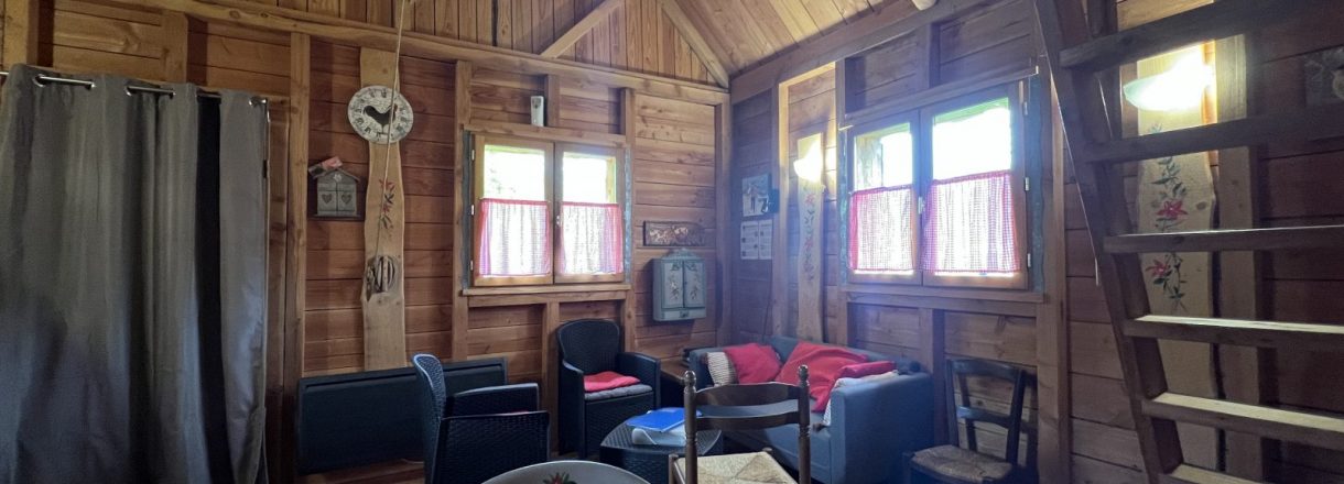 Chalet indépendant avec une grande terrasse comportant une table en bois avec bancs intégrés et barbecue. Rez-de-chaussée : Séjour avec coin cuisine et coin salon. Salle d'eau. WC. 1 chambre avec 1 lit 2 places (160 cm). En mezzanine (accès par une échelle meunière) 1 chambre avec 3 lits 1 place en 90 cm. Chauffage électrique. Terrain commun de 4000 m². Parking privatif commun. Service ménage sur demande.
