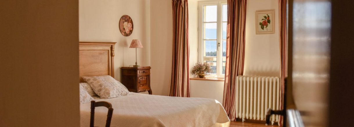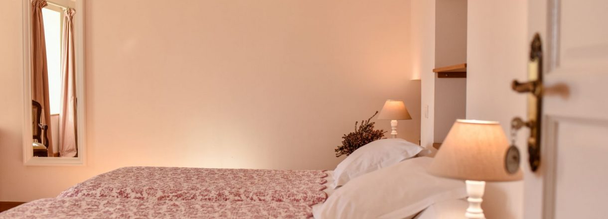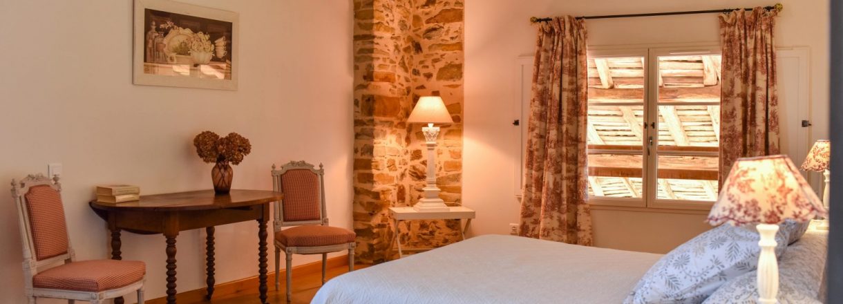 Une chambre lit double en 140x200 avec une salle de bains/douche/WC, adaptées pour des personnes à mobilité réduite, vue sur la campagne, murs en pierres et à la chaux, sol carrelé. 1 lavabo et WC indépendant.