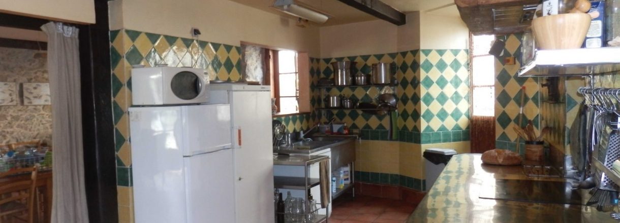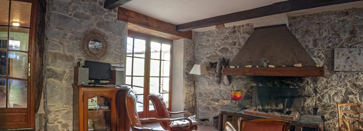 Au rez-de-chaussée, une grande cuisine tout équipée (plaques de cuisson, four, frigos, lave-vaisselle, cafetières, bouilloire… ) permet d’être autonome sur la confection des repas. Elle est ouverte sur une pièce à vivre de 45m², chaleureuse grâce sa cheminée à foyer ouvert. Deux grandes tables rustiques en bois permettent de recevoir 30 personnes à table.