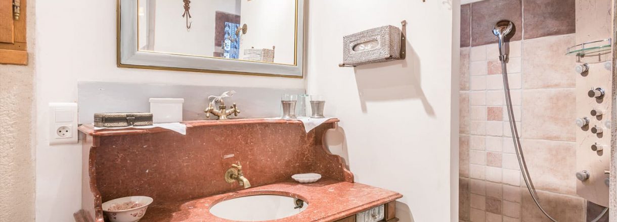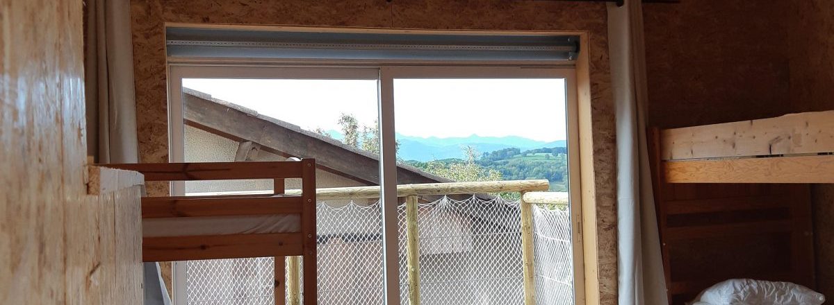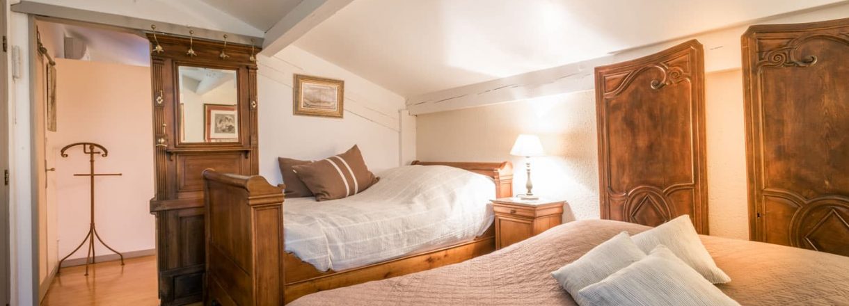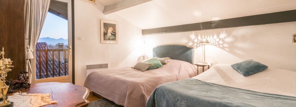 La chambre MERENS avec lit en 160 et deux lits en 140 avec salle de bains (jacuzzi , lavabo, douche & WC privatifs), dont le balcon donne plein sud sur la chaîne des Pyrénées.