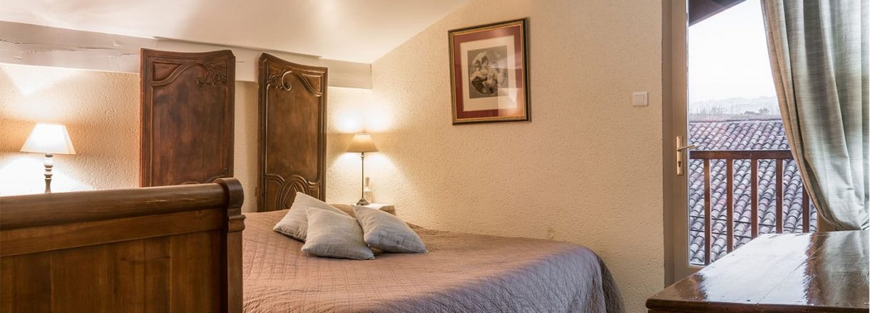 La chambre MORGAN avec lit en 180 King Size et un lit de 140 (un canapé lit de140) avec salle de bains douche, lavabo et WC privatifs, le balcon donnant plein sud sur la chaîne des Pyrénées.