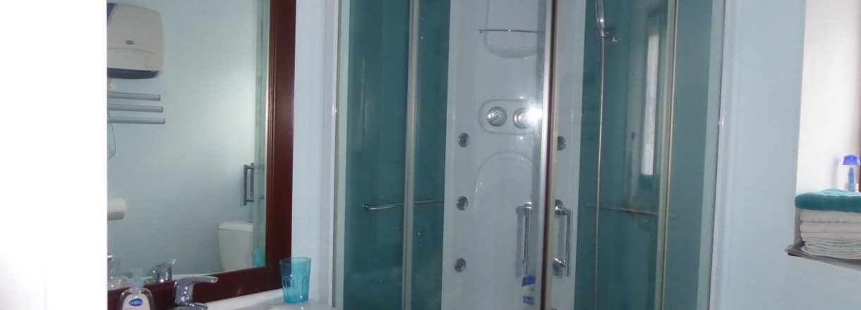 Salle d'eau avec lavabo, douche, WC, radiateur soufflant sèche serviettes