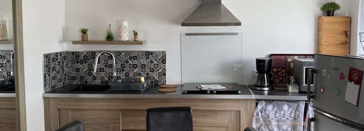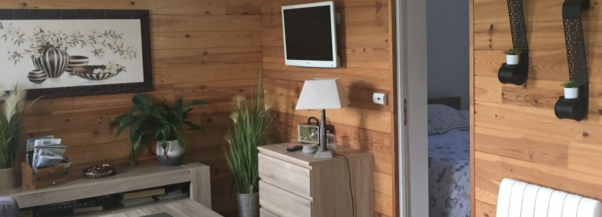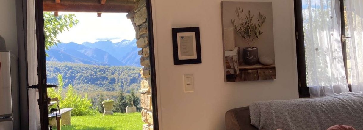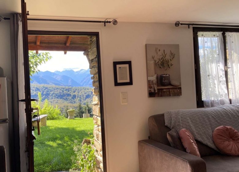 Logement privé de plain pied confortable et autonome, situé en RDC du bâtiment. Vue sur le Mont Valier. Cuisine ouverte sur le salon, avec un canapé convertible avec vue sur le Mont Valier. 2 adultes , 2 jeunes enfants