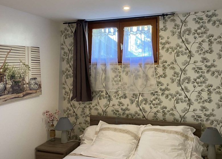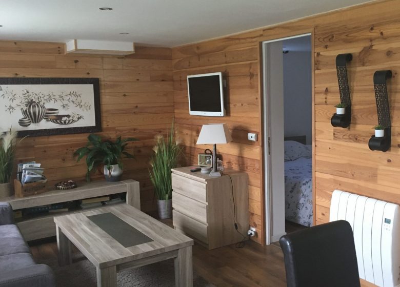 Studio au rez-de-chaussée du grand gîte, pour 2 à 4 personnes. Il est composé d'une chambre avec un lit 2 places et d'un convertible dans le salon pour venir avec vos enfants. La cuisine , ouverte sur le salon, est équipée pour votre plus grand confort. Cheminée, TV et Wi-Fi.