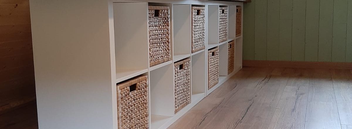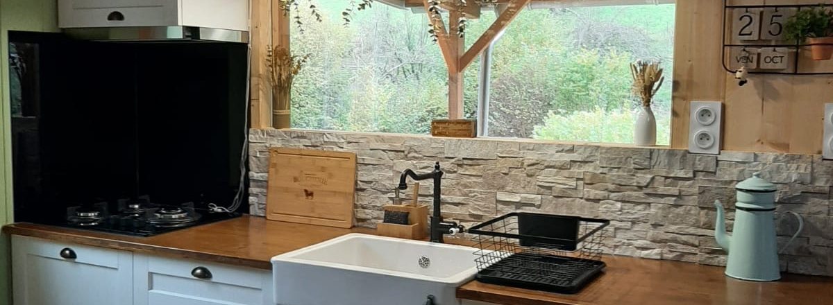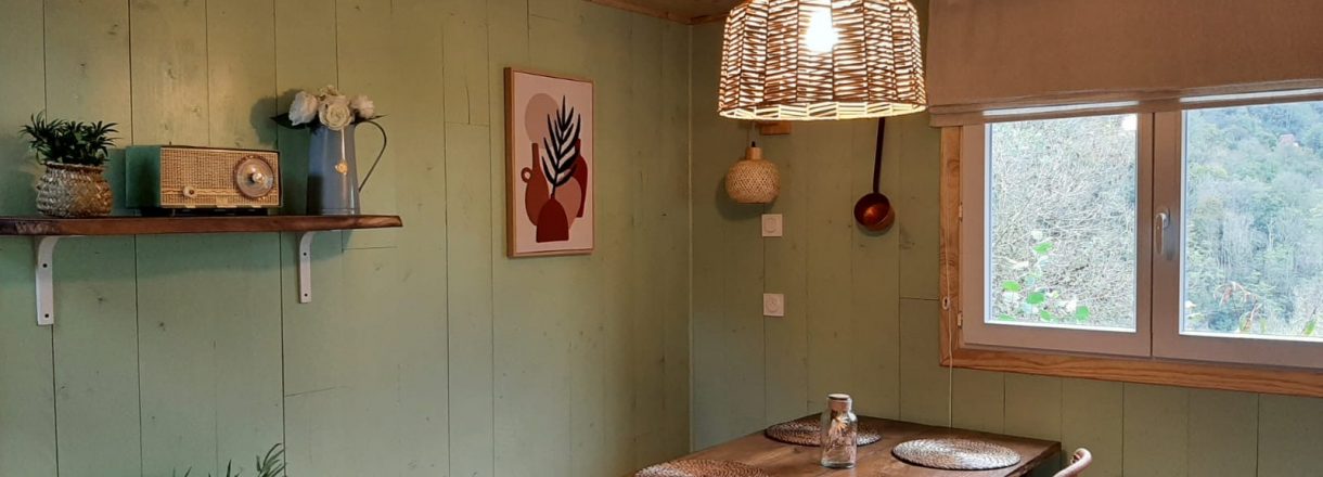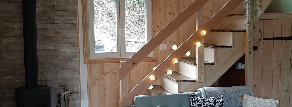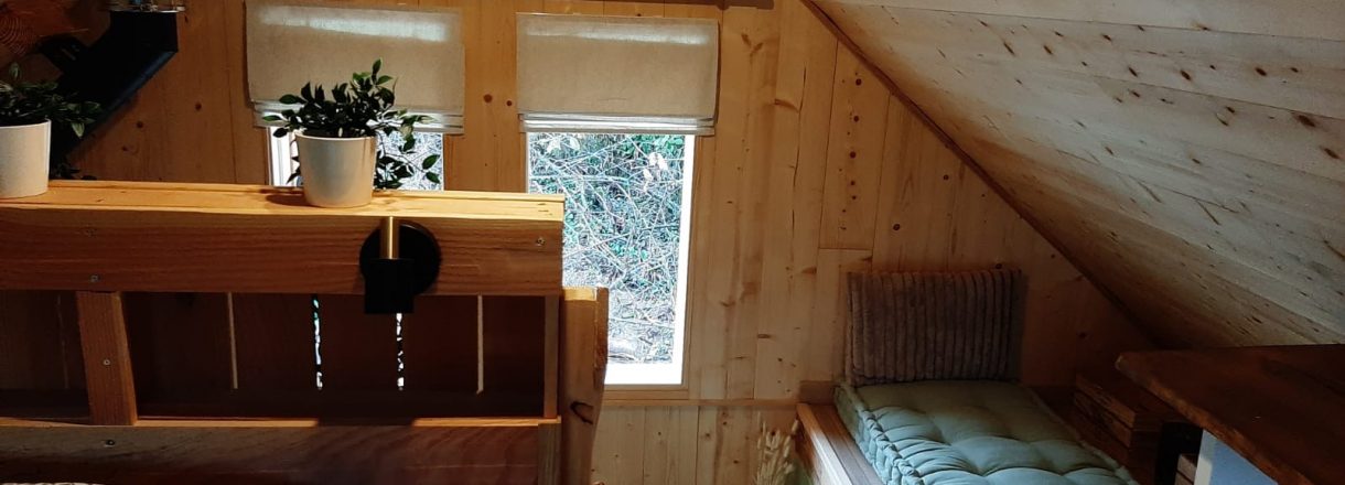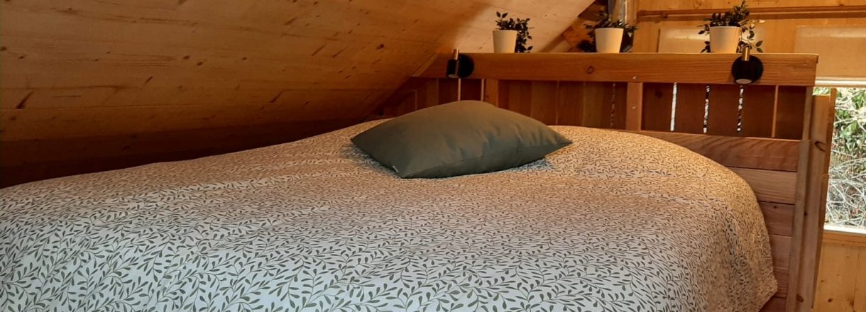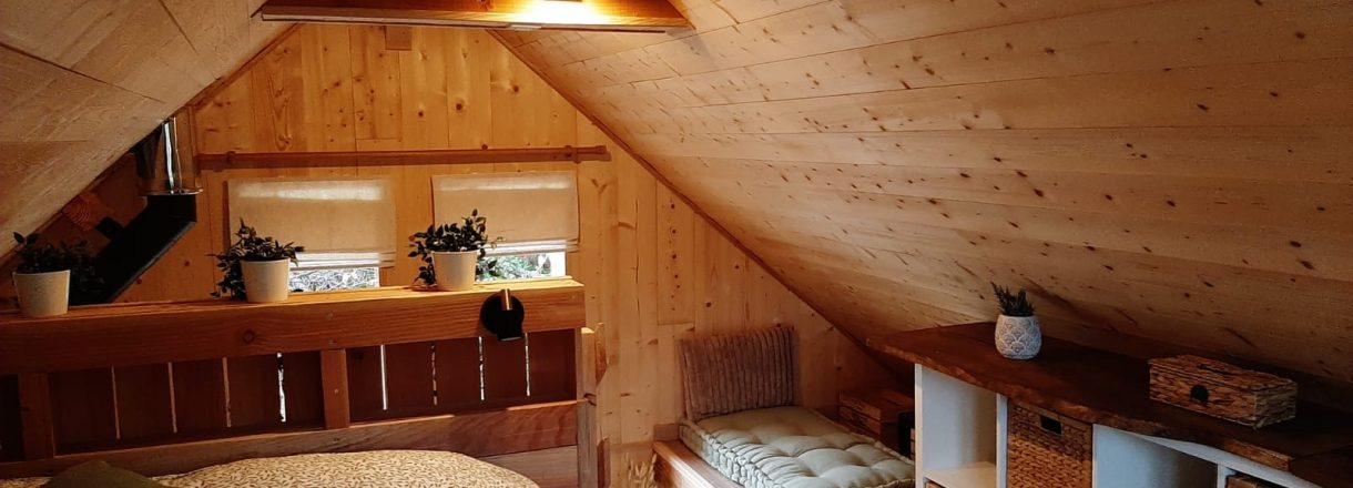Le chalet comprend une surface habitable confortable avec 1 chambre avec lit double en mezzanine à l’étage, une salle de bain, lavabo et WC, un salon/cuisine ouvert au rez-de-chaussée, une seconde chambre avec lit double indépendante au rez de chaussée.