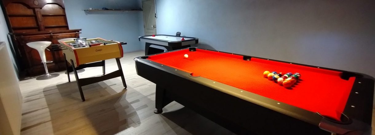 - Salle de jeux (avec chauffage central pour en profiter pendant les mois d'hiver), comprenant un billard (convertible en ping-pong), un Babyfoot, et un Air hockey.