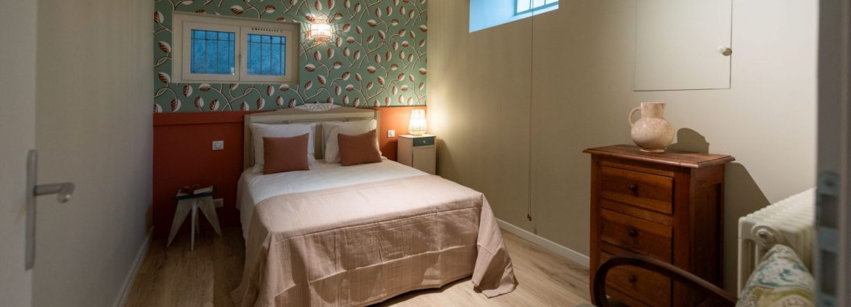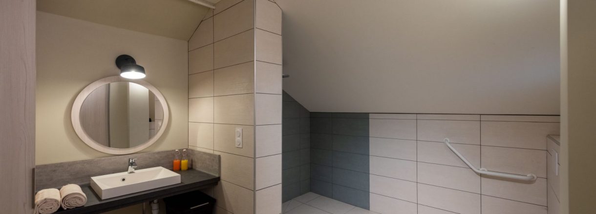 La salle de bain est pourvue d’une douche à l’italienne avec siège, d’un WC, d’un coin lavabo, le tout en accès handicapé ou mobilité réduite.