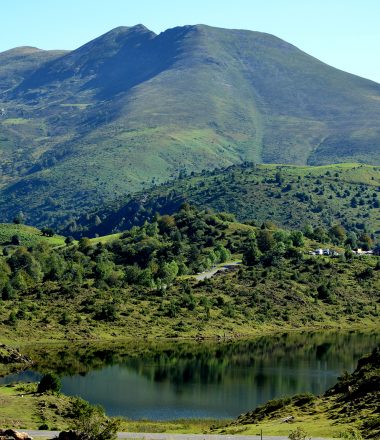Dans les eaux calmes et transparentes de l’étang d’Araing se reflètent l’impressionnant Pic du Crabère.