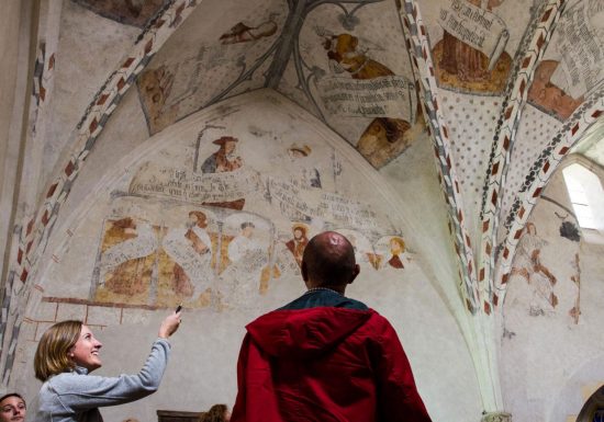 La cathédrale paroissiale dans la ville basse, au choeur décoré de fresques romanes, est dotée d’un