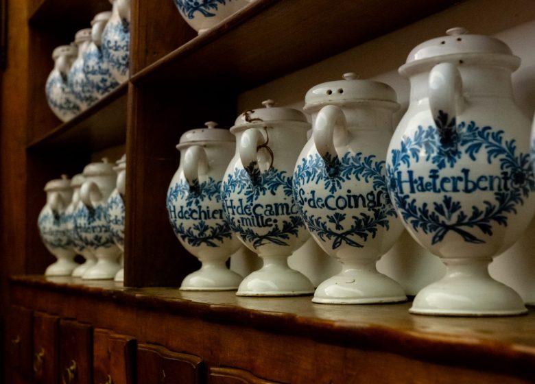 Les murs, ornés de boiseries en merisier et poirier Louis XV, sont copieusement garnis de pots, de vases en faïence et de bouteilles soufflées contenant anciennement une variété de concoctions extraites des règnes végétal, minéral et animal. Outre son utilité médicinale et la préparation de médicaments pour soulager les malades, la pharmacie était également une véritable salle d'opération. Exposés dans un des cabinets au coin de la pièce, des instruments d’époque (scies, tourniquets et autres), servaient jadis à effectuer des interventions chirurgicales directement sur la table en marbre placé au centre de la pharmacie. Cet arsenal témoigne de nos jours de l’évolution des pratiques de la médecine au travers des siècles !